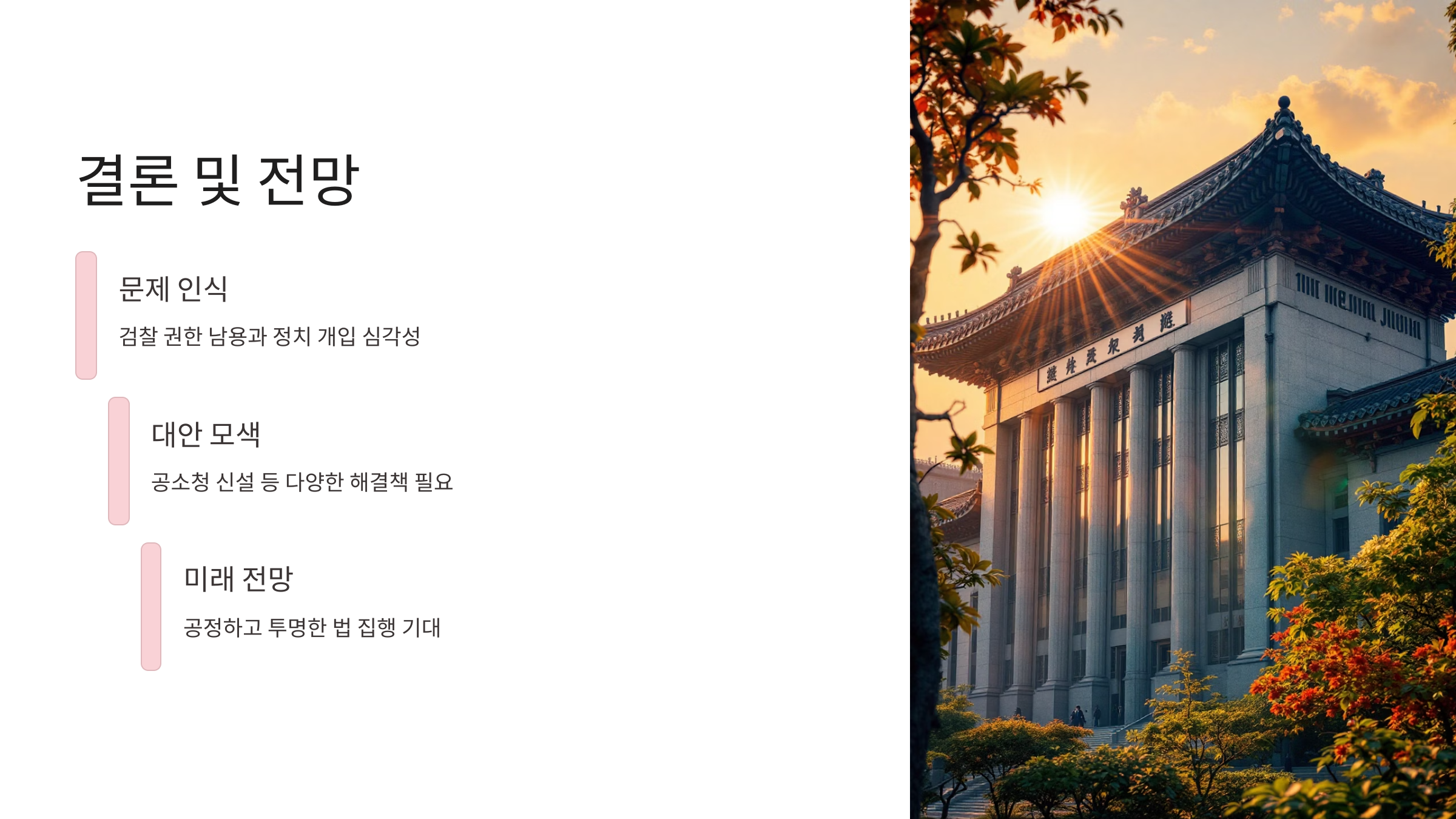 검찰청 폐지 논란과 공소청 신설 가능성은 우리 사회의 법과 제도에 대한 중요한 논의의 일환으로, 그 배경과 필요성을 충분히 이해해야 한다. 검찰의 권한 남용과 정치 개입 문제는 더 이상 간과할 수 없는 심각한 문제이며, 이를 해결하기 위한 다양한 대안이 요구된다. 공소청 신설은 이러한 문제를 해결할 수 있는 한 가지 방안으로써, 보다 공정하고 투명한 법 집행을 가능하게 할 것으로 기대된다.