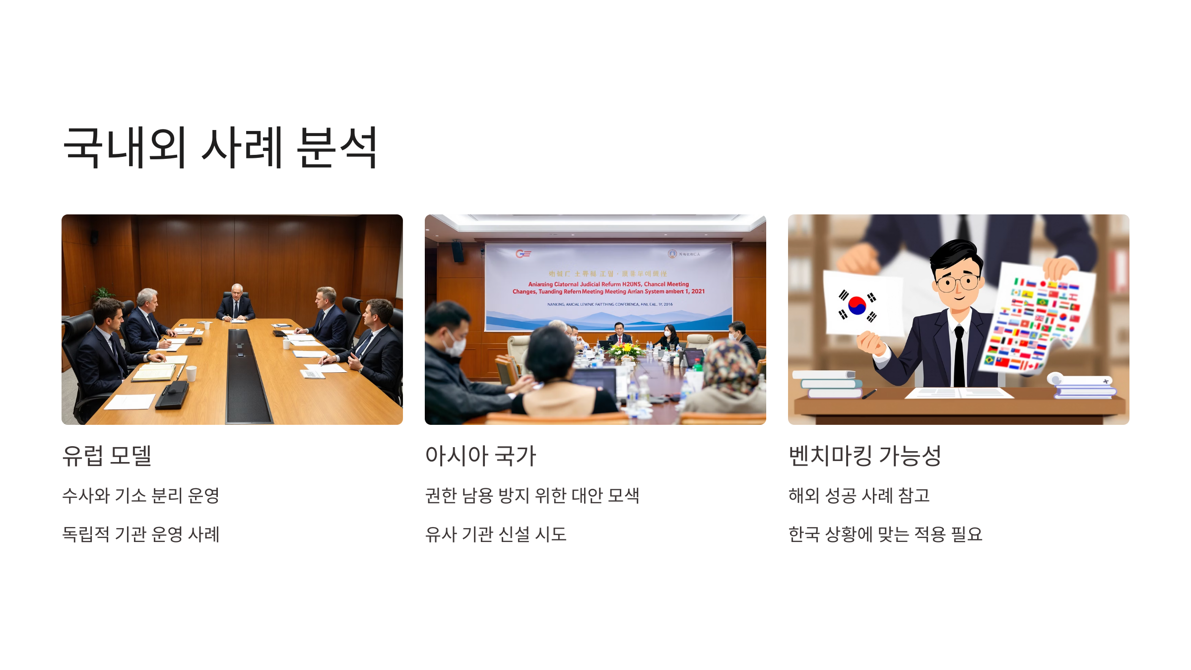 - 다른 나라에서의 유사한 사례는 무엇이 있나요? 유럽과 아시아 여러 국가에서 검찰의 기능 분리를 시도하고 있습니다.