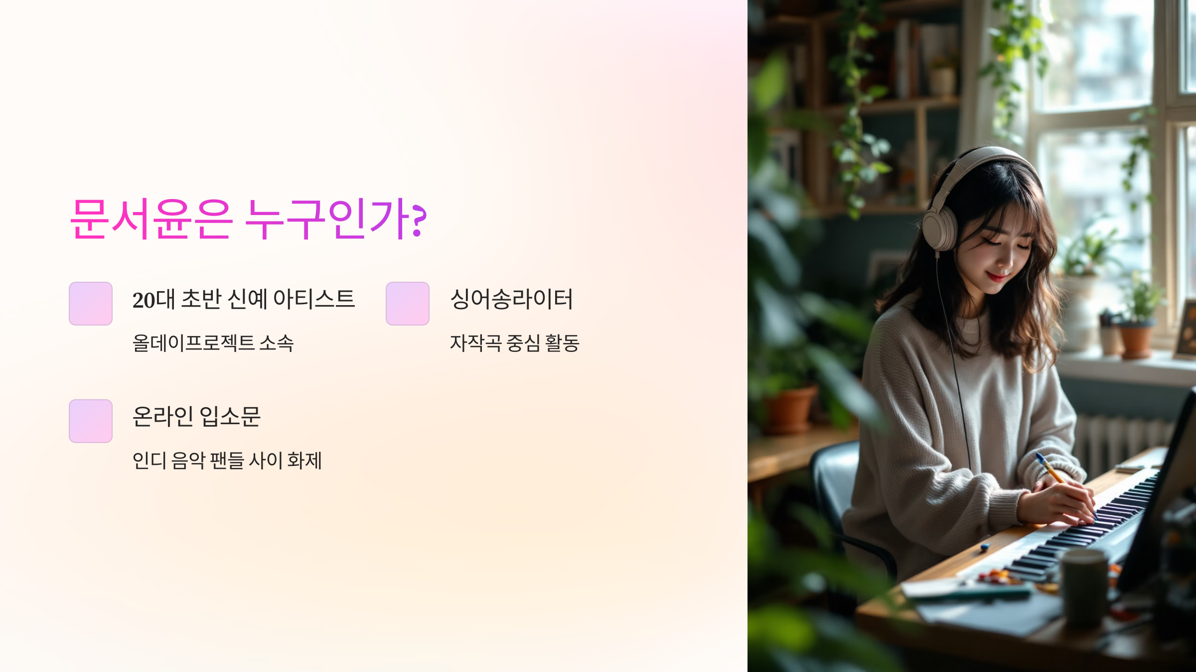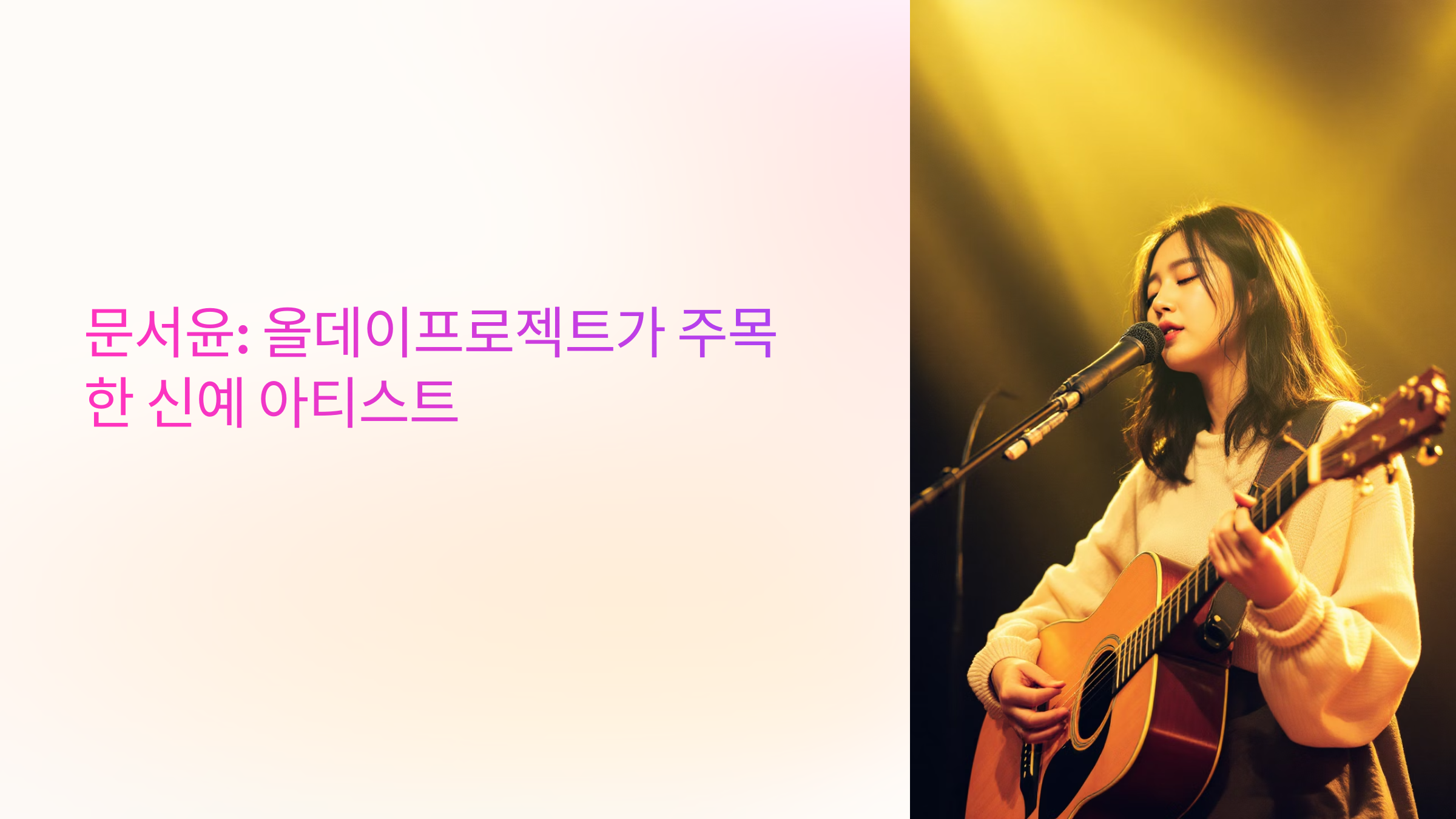문서윤이라는 이름이 갑작스레 떠오르기 시작한 건 꽤 최근의 일이에요. 아직 방송이나 대중적인 미디어에서는 많이 알려지진 않았지만, 온라인 커뮤니티와 인디 음악 팬들 사이에서는 벌써부터 입소문이 퍼지고 있죠. 그녀는 20대 초반의 신예 아티스트로, 올데이프로젝트라는 독립 크리에이티브 레이블에서 활동을 시작했어요. 싱어송라이터로서 자작곡 중심의 활동을 이어가며 '진짜 자신만의 이야기'를 풀어내는 데 집중하고 있답니다.