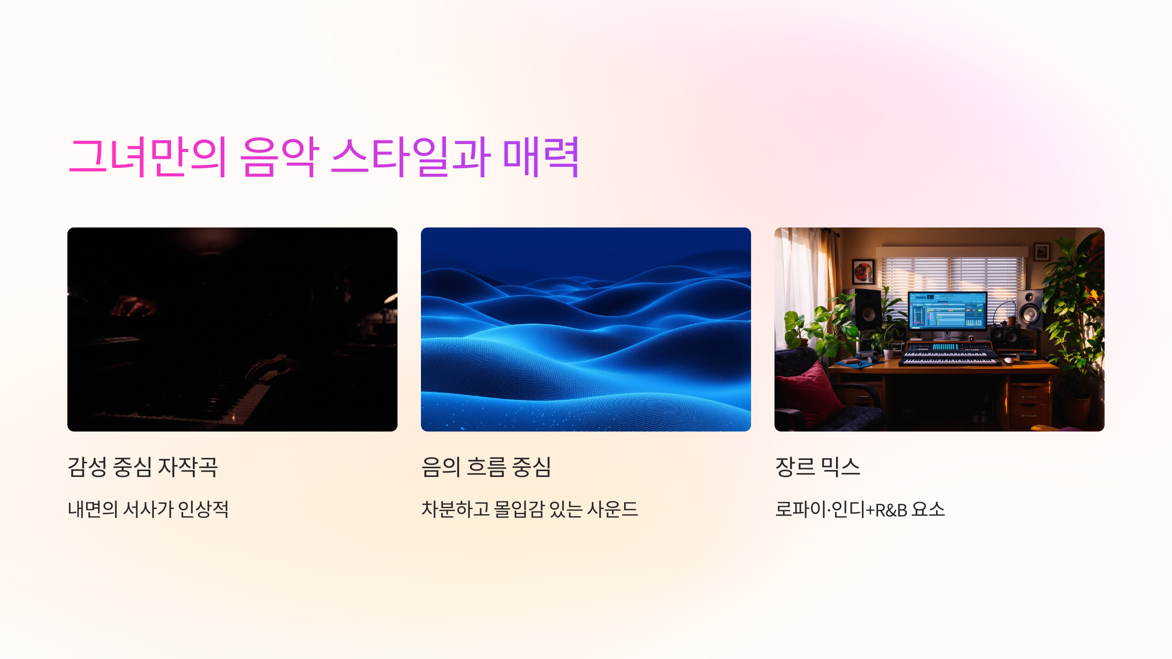 - 감성 중심의 자작곡 비중 높음