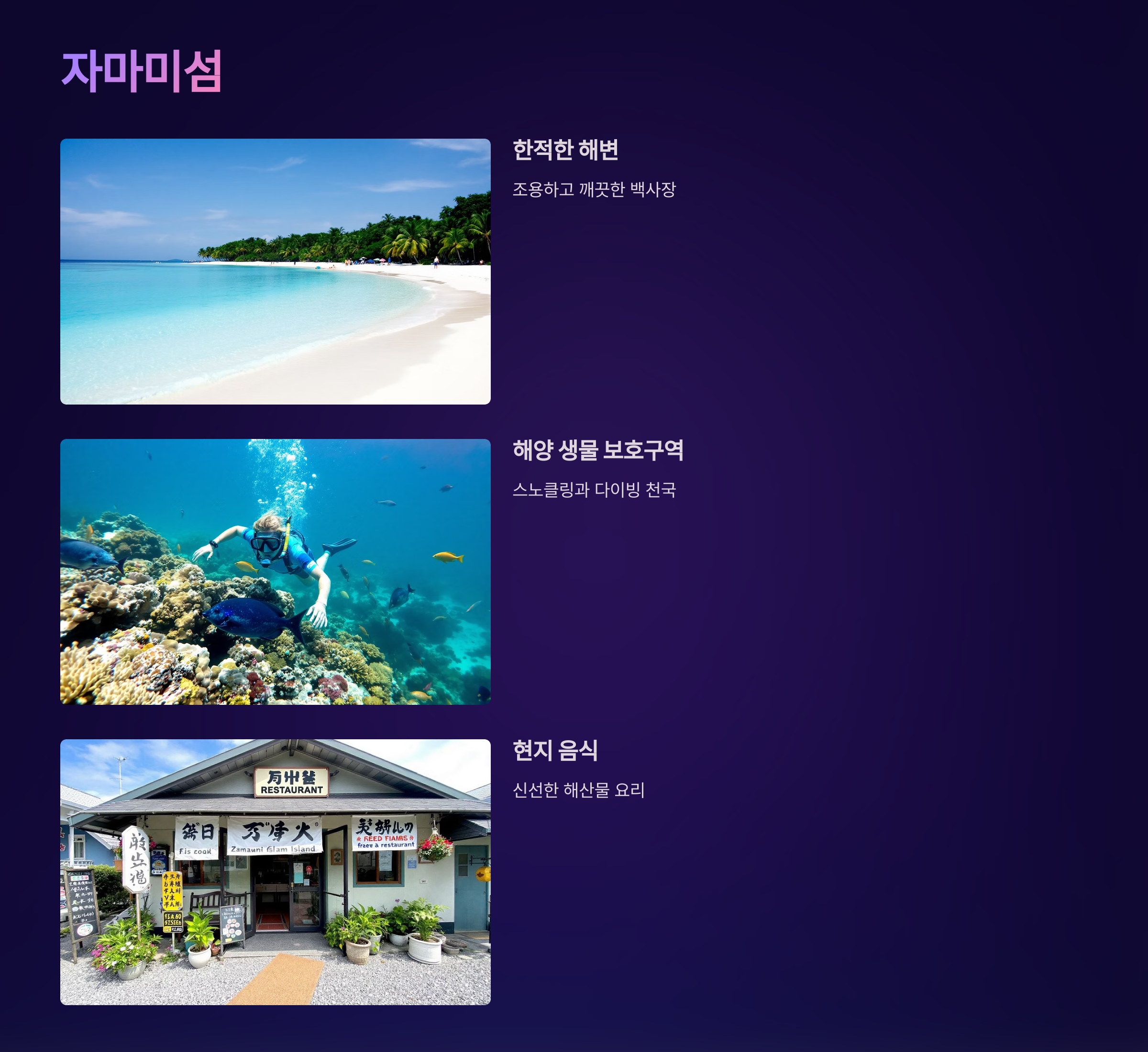 자마미섬은 또한 해양 생물 보호구역으로 지정되어 있어, 스노클링을 통해 다양한 해양 생물들을 가까이에서 관찰할 수 있습니다. 현지의 작은 식당에서 신선한 해산물 요리를 맛보는 것도 놓치지 마세요. 자마미섬의 조용한 분위기는 여러분의 마음을 편안하게 만들어 줄 것입니다.
