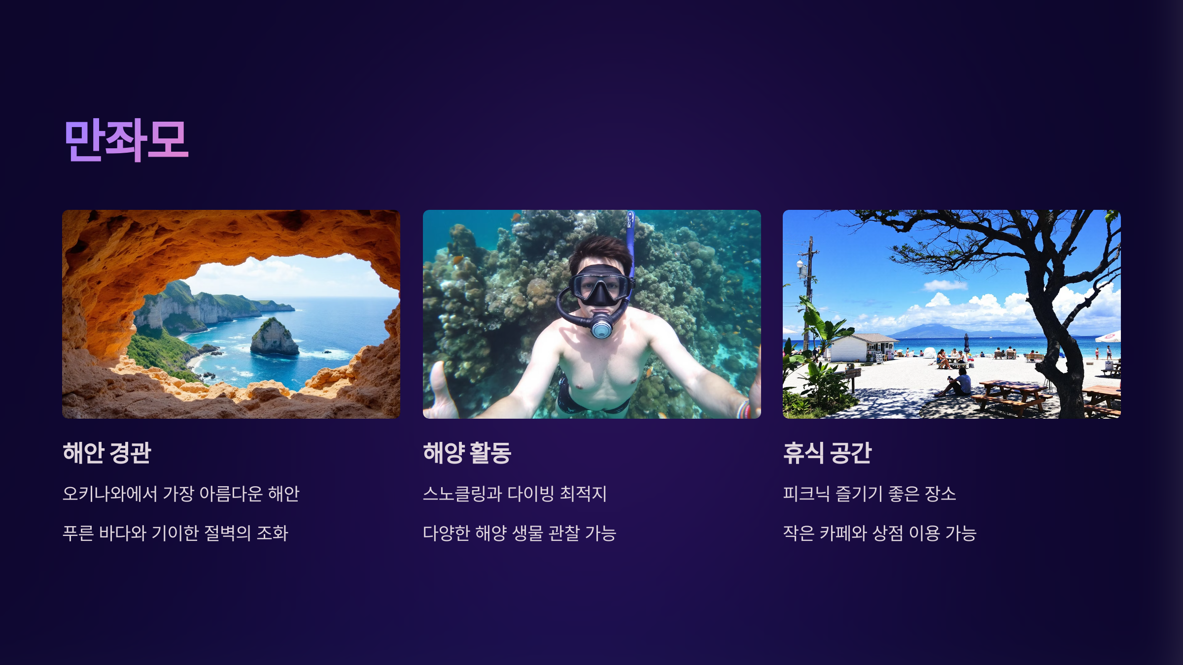 특별한 추억을 만들어 줄 오키나와의 매력적인 장소들을 방문하여, 그곳에서의 소중한 순간들을 만끽하시길 바랍니다. 새로운 경험과 맛, 그리고 문화가 어우러진 오키나와에서 행복한 여행이 되시길 기원합니다.