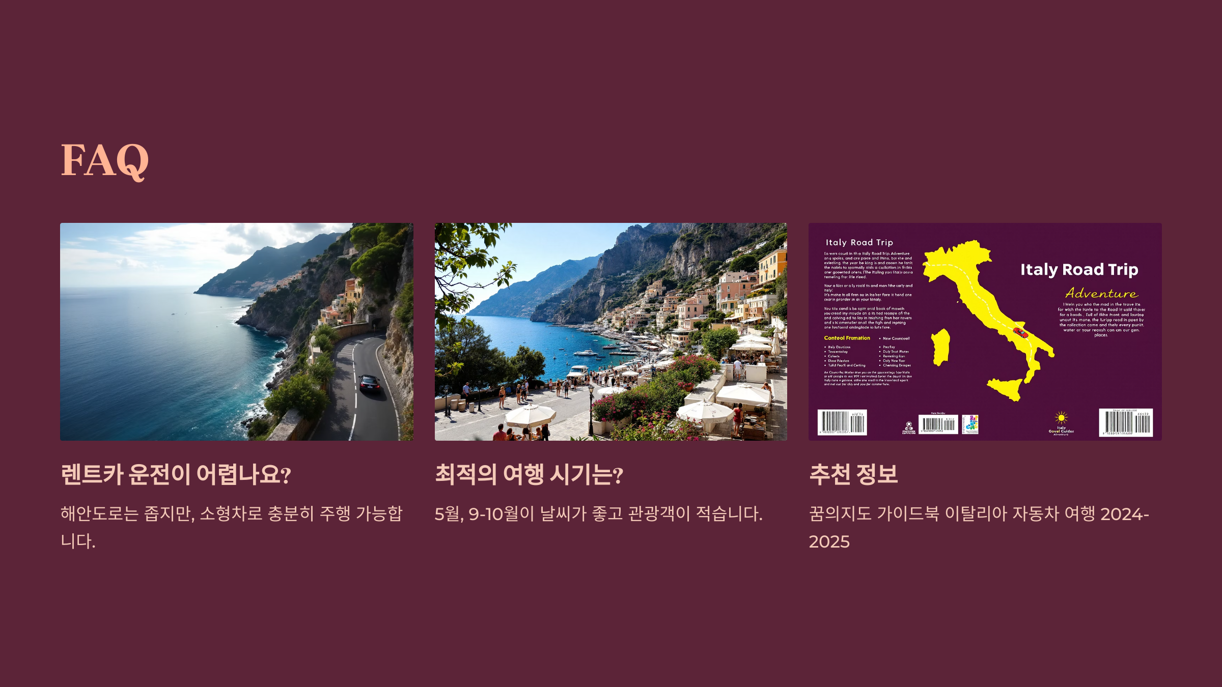 아말피 코스트는 지중해의 경치를 만끽할 수 있는 최고의 드라이브 코스입니다. 해안 절벽을 따라 펼쳐지는 도로는 매력적인 경치를 제공하며, 드라이브 중에 여러 멋진 포인트에서 사진 촬영을 즐길 수 있습니다. 특히 해안가의 작은 마을들을 방문하는 것도 잊지 마세요.