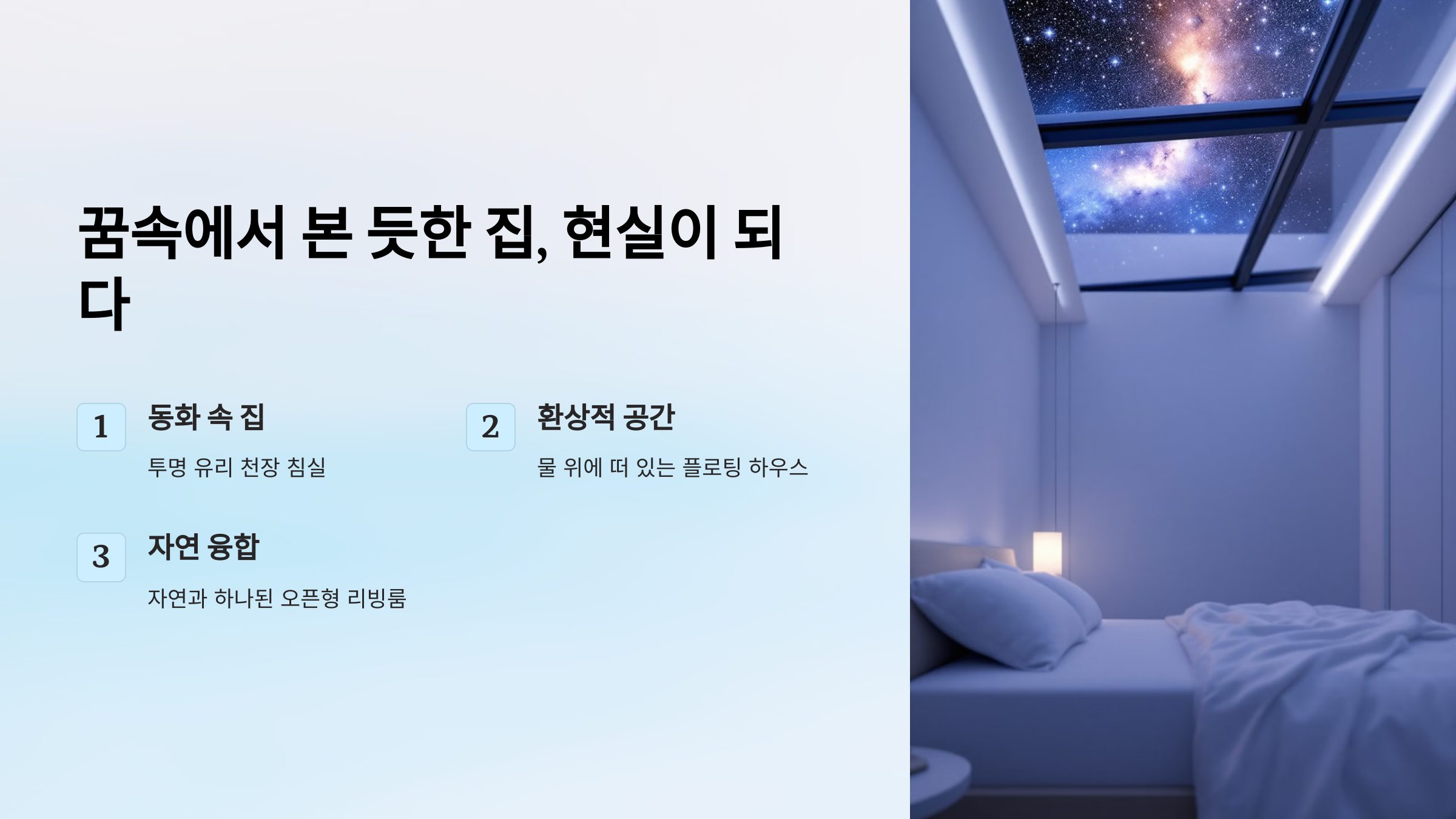 어릴 때 꿈에서 본 환상적인 집, 현실에서도 가능할까요? 요즘 건축과 인테리어 기술의 발전으로, 마치 동화 속에서나 나올 법한 집들이 현실이 되고 있습니다. 천장이 투명한 유리로 되어 밤하늘을 감상할 수 있는 침실, 물 위에 떠 있는 듯한 플로팅 하우스, 자연과 완전히 하나 된 오픈형 리빙룸까지! 상상 속에서만 가능할 것 같았던 공간들이 이제는 실제 거주 공간으로 자리 잡고 있습니다.