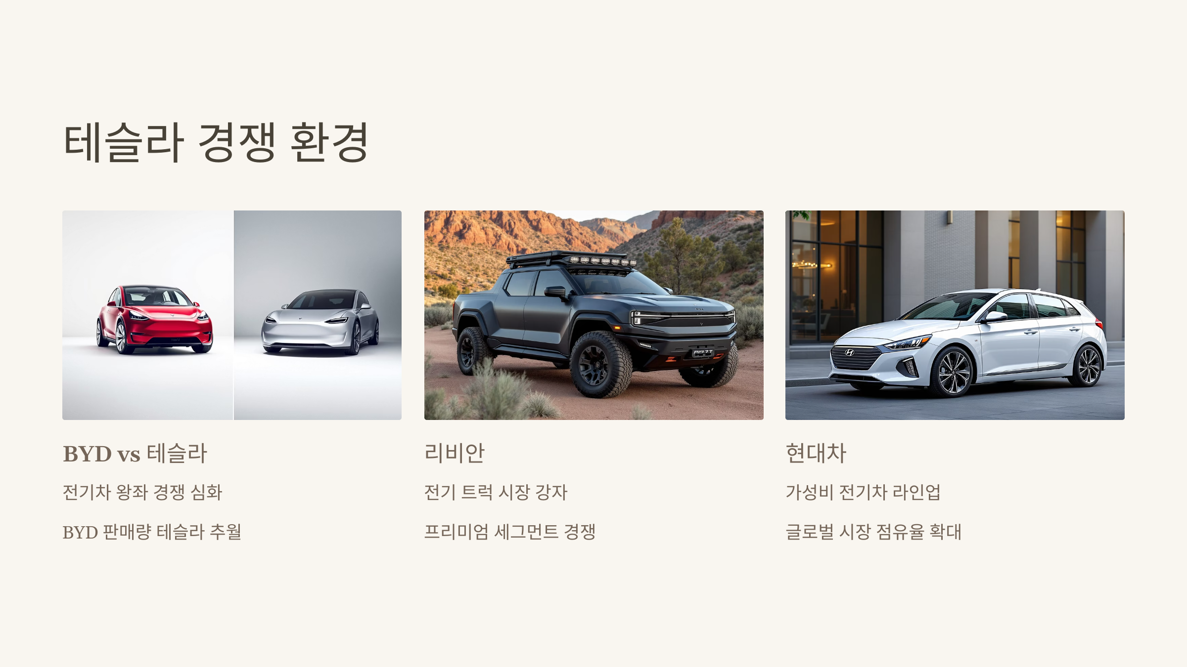 - 경쟁사 기술 진보 속도: BYD, 리비안, 현대차 등