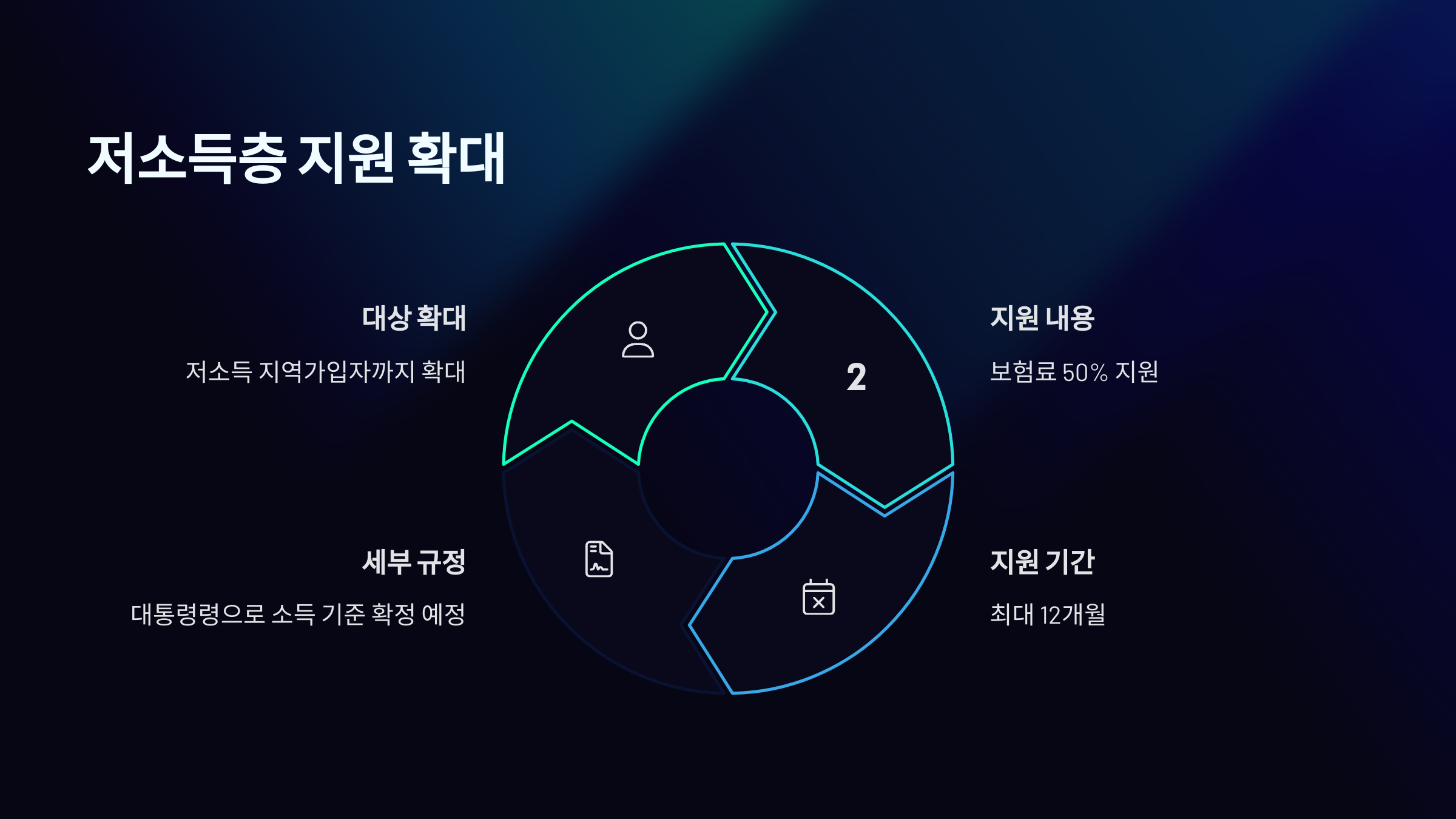 지금까지는 납부 이력이 있는 사람만 보험료 지원을 받았지만, 앞으로는 일정 소득 이하 지역가입자까지 확대되어 12개월간 보험료 절반을 국가가 지원합니다.