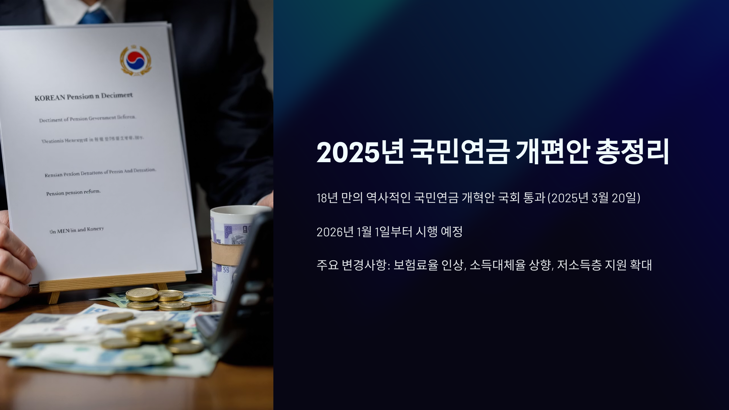 2025년, 드디어 국민연금 개편안이 국회를 통과했습니다. 많은 분들이 "연금 얼마 오르지?", "보험료는 얼마나 내야 하나?" 궁금해하실 텐데요. 이번 포스팅에서는 2025년 국민연금 개편안의 핵심 내용과 함께 달라지는 연금 수령액을 쉽고 정확하게 정리해드리겠습니다.