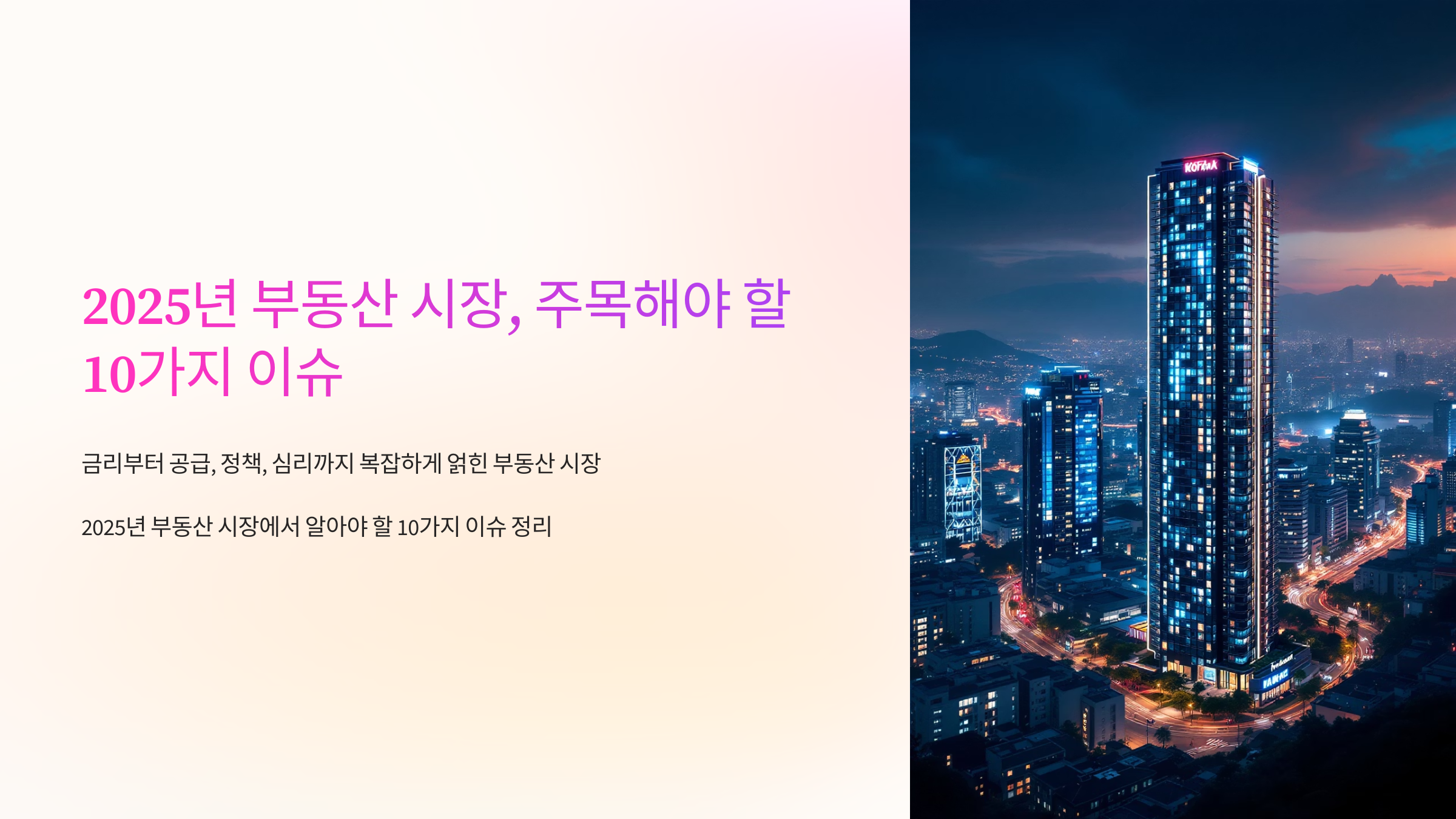 안녕하세요, 요즘 부동산 시장 흐름 보면서 혼란스러운 분들 많으시죠? 저도 최근에 집을 알아보느라 발품을 좀 팔았는데, 상황이 예전 같지가 않더라고요. 여기저기서 금리 인하 얘기 나오고, 정책도 왔다 갔다 하고, 전세는 갑자기 오르고… 이러다 보니 도대체 언제 움직여야 하나 고민이 더 커지는 것 같아요. 그래서 오늘은 2025년 부동산 시장에서 우리가 꼭 알아야 할 10가지 이슈를 정리해봤어요. 이걸 알아야 전략이 보이거든요. 단순히 숫자와 그래프만 보는 게 아니라, 심리와 흐름까지 읽어야 하는 시장이니까요. 그럼 함께 차근차근 뜯어보도록 해요!