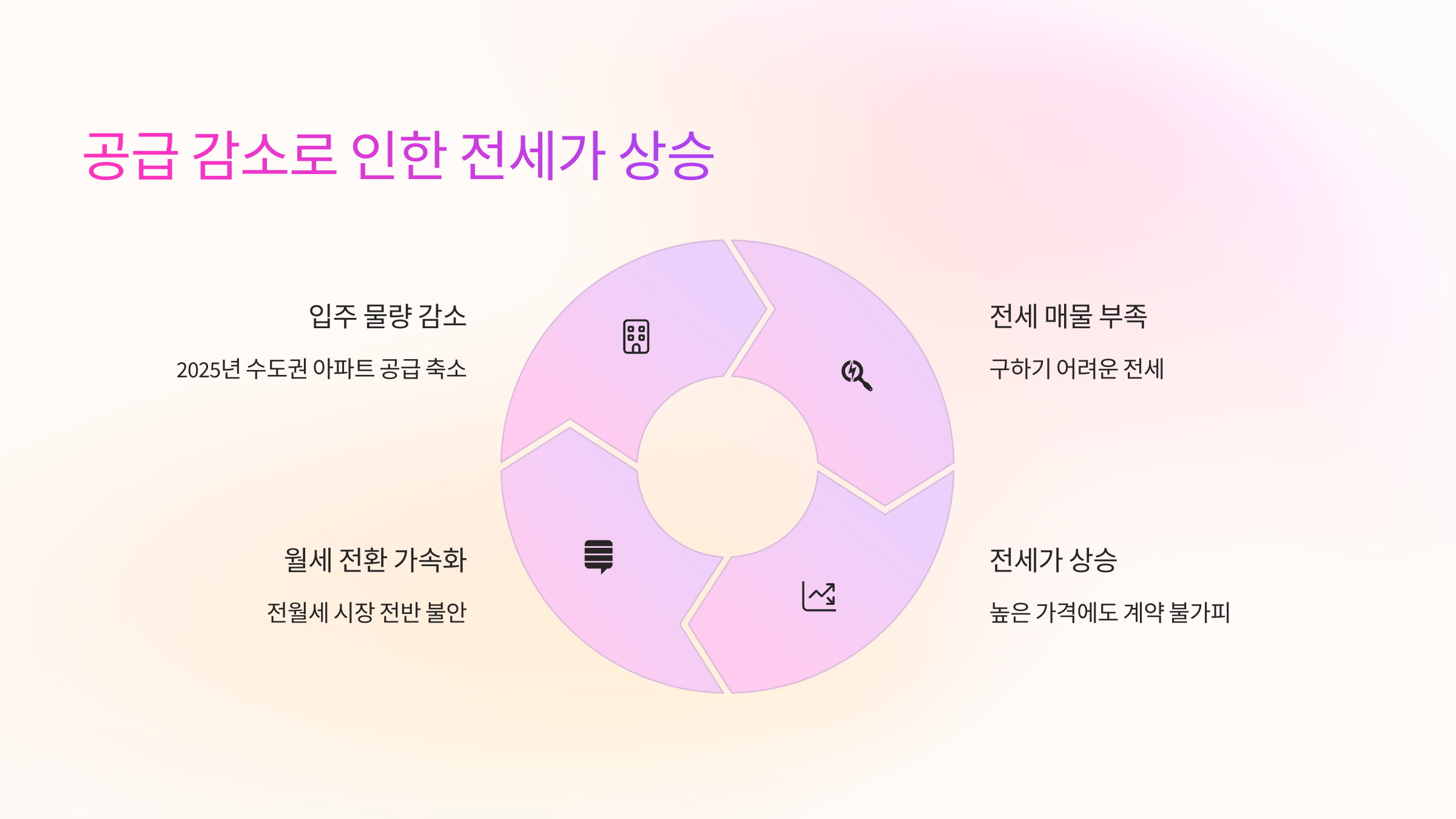 2025년 수도권 입주 예정 아파트 물량이 눈에 띄게 줄어들면서 전세시장에 빨간불이 켜졌습니다. 공급이 줄어드니 자연스레 전세 매물도 귀해지고, 전세를 원하는 수요자들은 더 높은 가격이라도 구해야 하는 상황이죠. 특히 아이 학교나 직장 문제로 꼭 특정 지역에 살아야 하는 수요층은 울며 겨자 먹기로 비싼 전세를 선택하는 경우도 많아졌어요. 이렇게 되면 월세로의 전환도 가속화되면서 전월세 시장 전반이 들썩일 가능성이 큽니다.